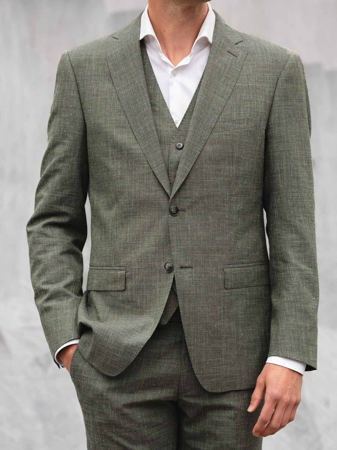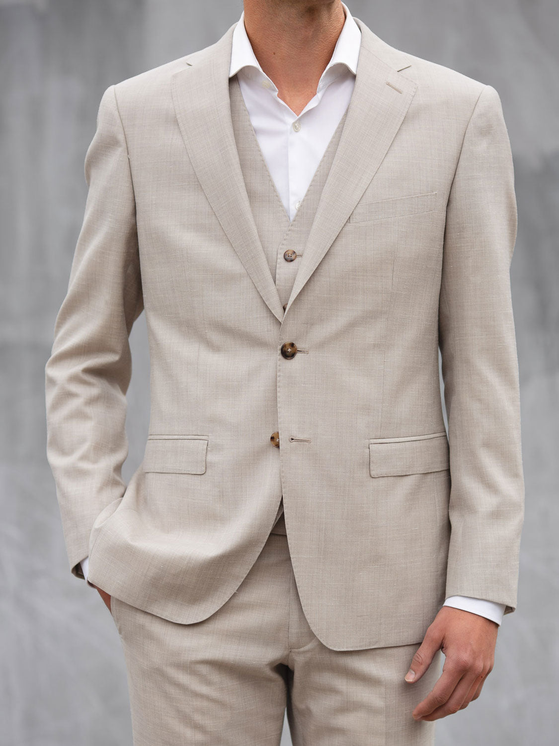Neben der Farbe spielt auch der Stoff eine entscheidende Rolle. Bei uns wählst du aus einer großen Auswahl hochwertiger Stoffe: von luftigen Leinenqualitäten über strukturierte Gewebe bis hin zu fein gewebten Wollstoffen. So passt dein Maßanzug auch zur Jahreszeit.